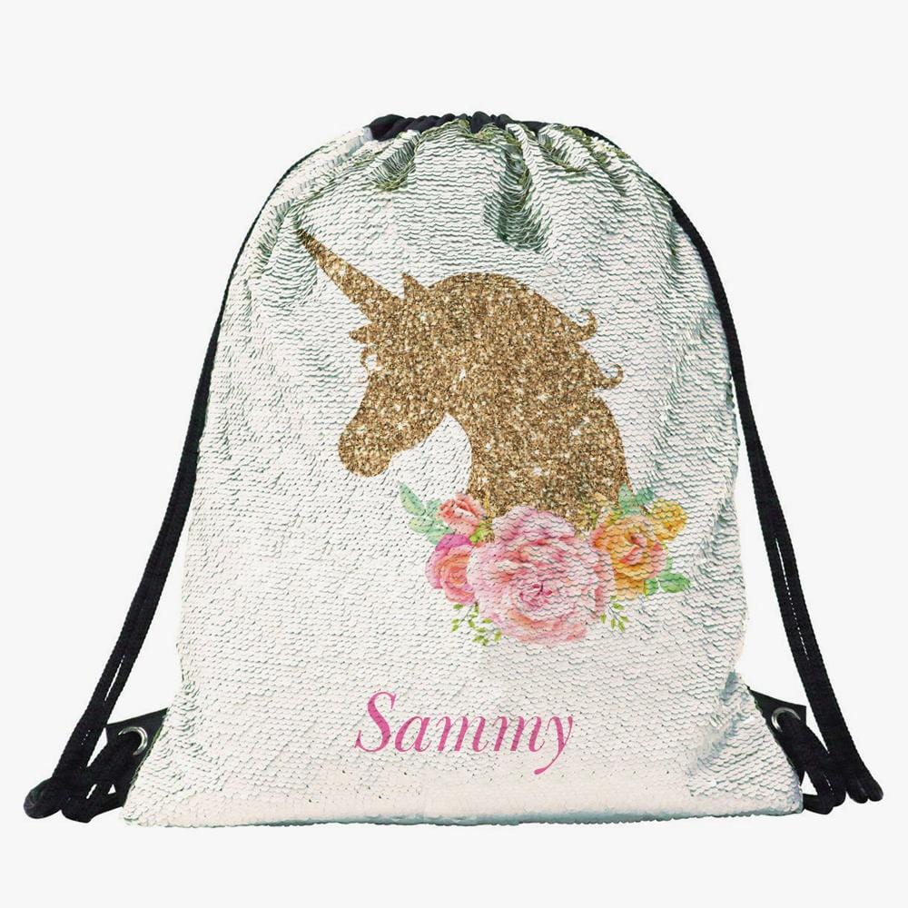 Gold Unicorn Personalized Kids Flip Sequin Drawstring Bag | Custom Backpacks
