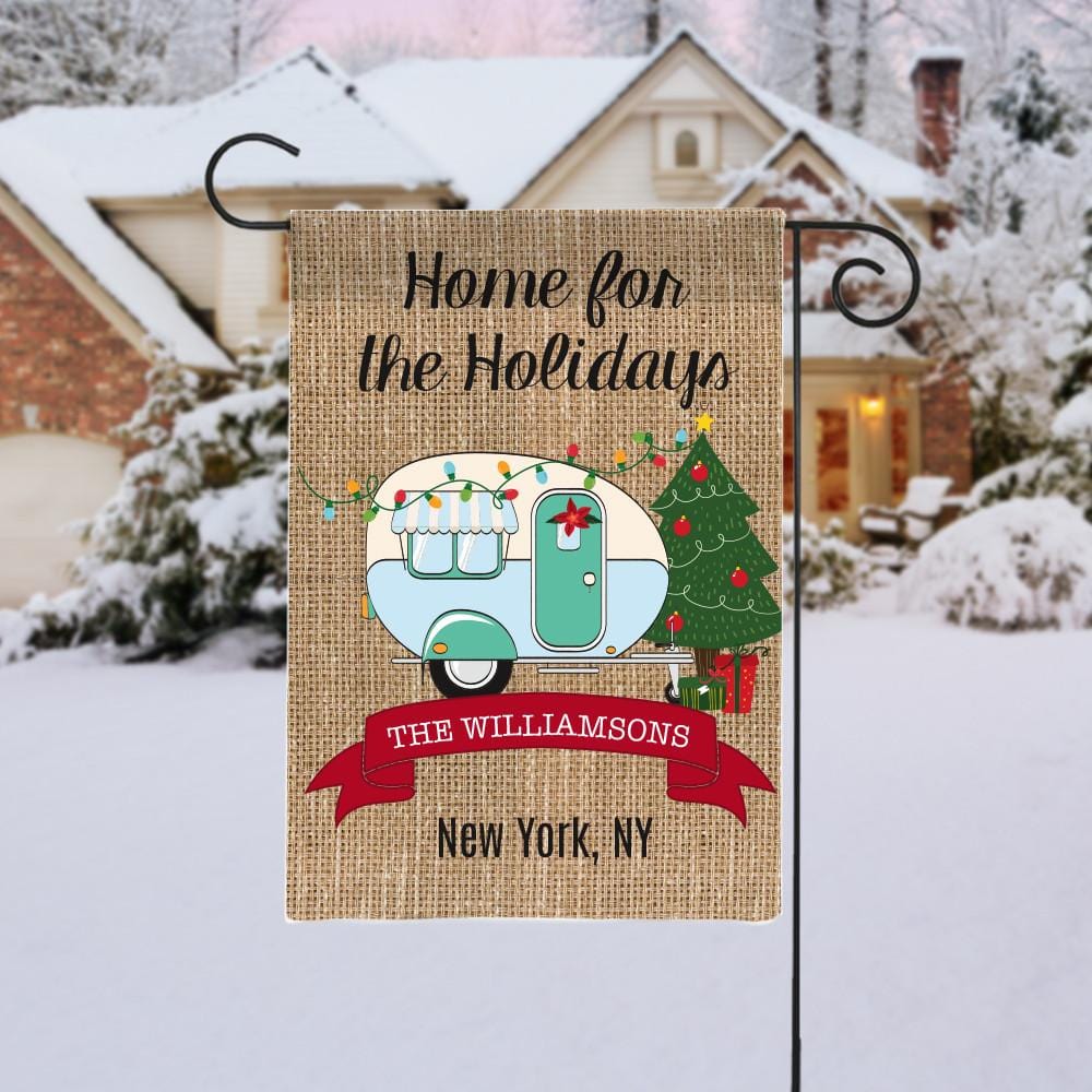 This Happy Holidays Custom Christmas Garden Flag will beautifully enhance any garden! Your passersbyers will love it! Flag features the caption 'Happy Holidays' on the center front with your family name, or any text of choice, on the bottom front, all on a blue background with reindeer antlers and a wreath. The garden flag measures 12" x 18" flag and is made of 100% polyester. Upgrade to a house flag for an additional fee of only $8. Garden flag makes a wonderful house warming gift.